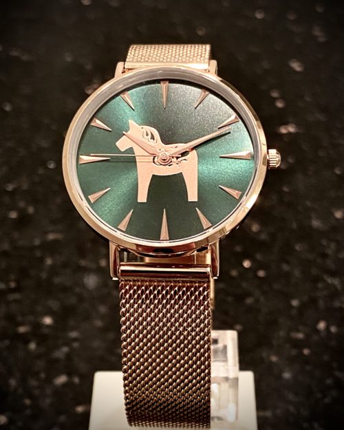 Vacker unik klocka med boett i rosé samt med skimrande silvrig tavla och häst i rose.